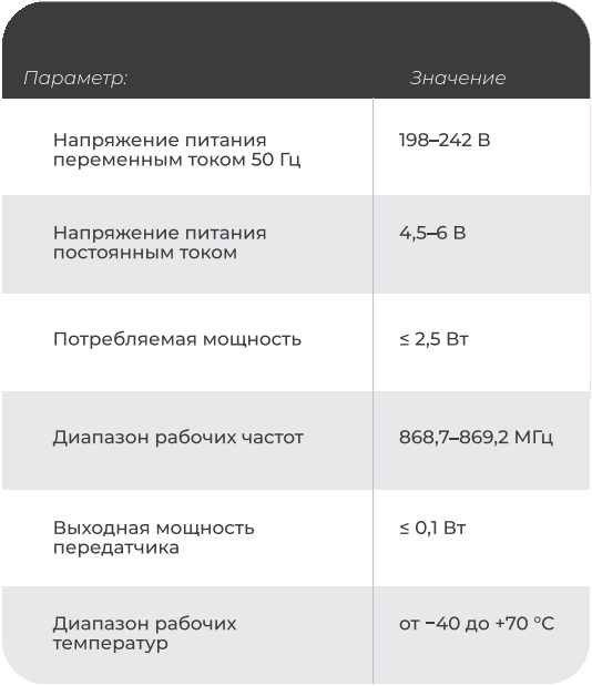 Написать WhatsAppТехнические характеристики электропитания и радиоканала